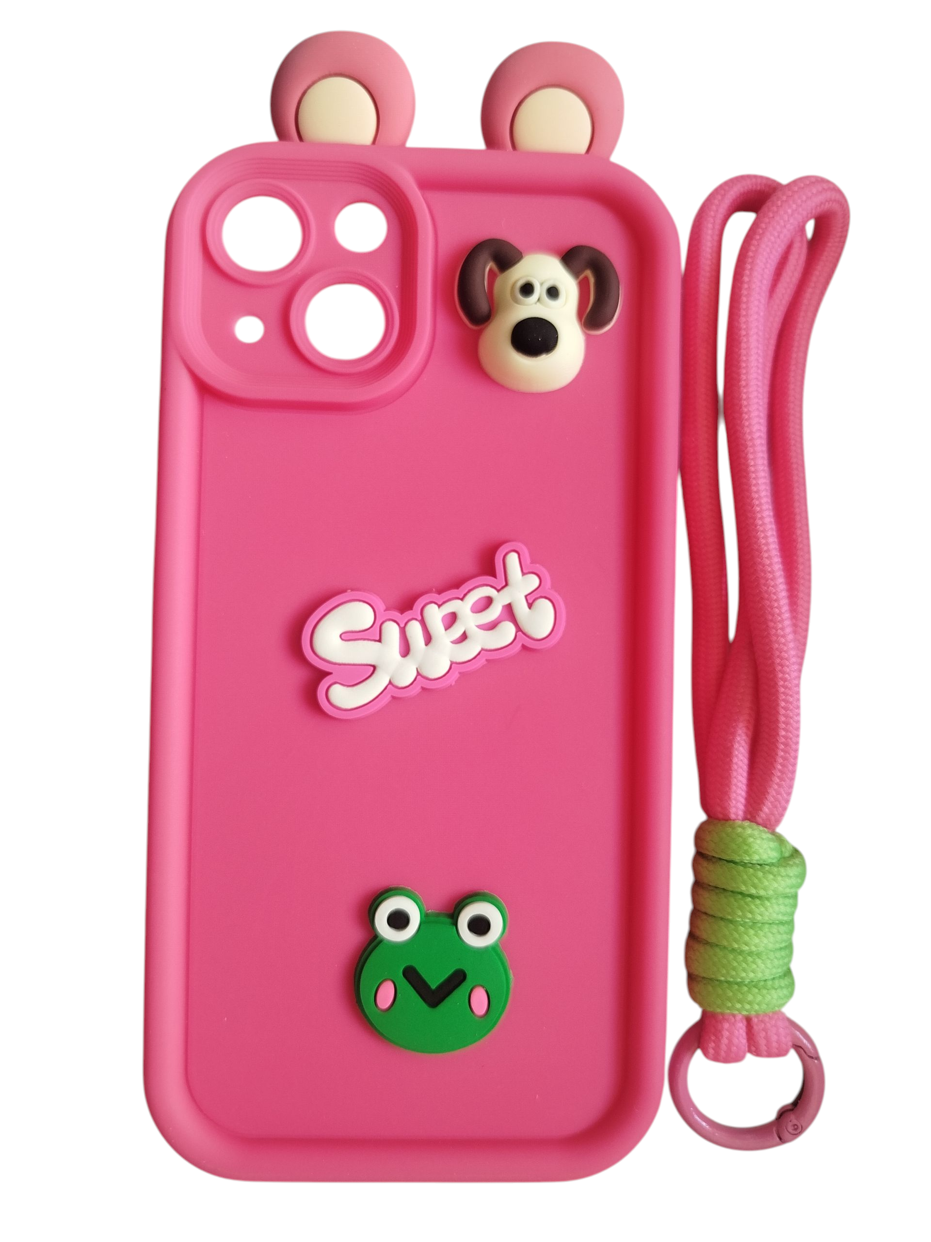 قاب دخترانه فانتزی عروسکی آیفون 14 پرو مکس آویزدار طرح قورباغه و سگ (Sweet)